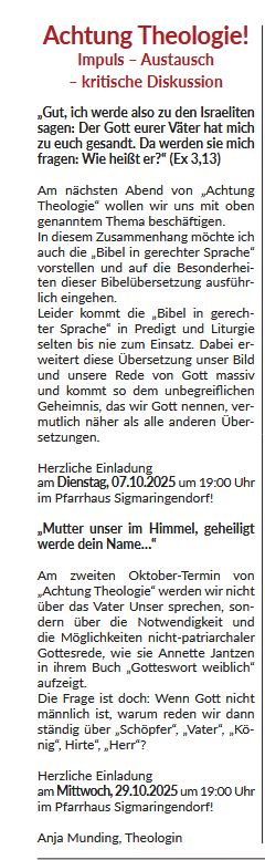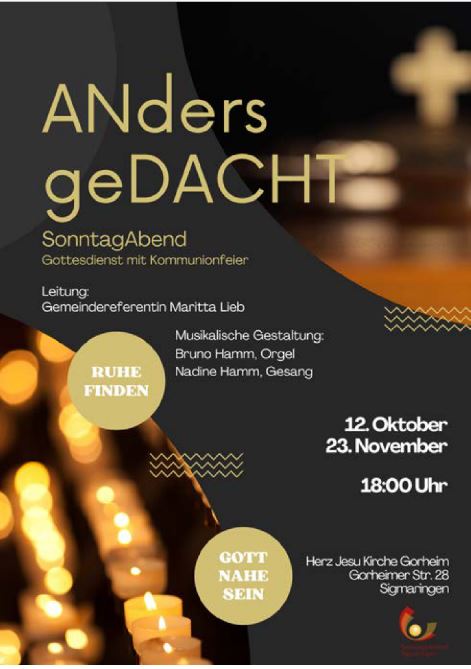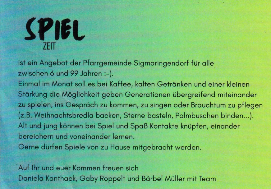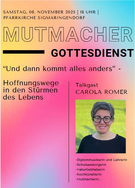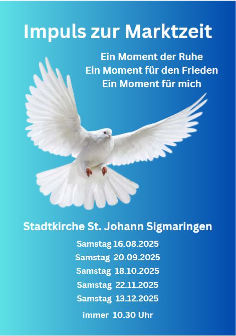 mittwochs 12.2. / 9.4. /11.6. 13.8./ 15.10.25/ 17.12.25 Kirchenchor Sigmaringendorf ![]() Lobpreis- Entspannung - Gemeinschaft Lust mitzusingen? Kirchenchor Sigdorf Do, 19.30 Uhr im kath.Gemeindehaus Erste Probe nach den Sommerferien am Do, 18.9.25 Wer singt, betet doppelt. |