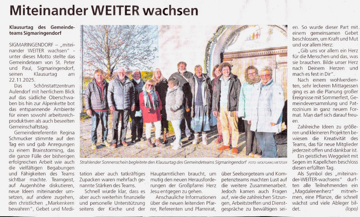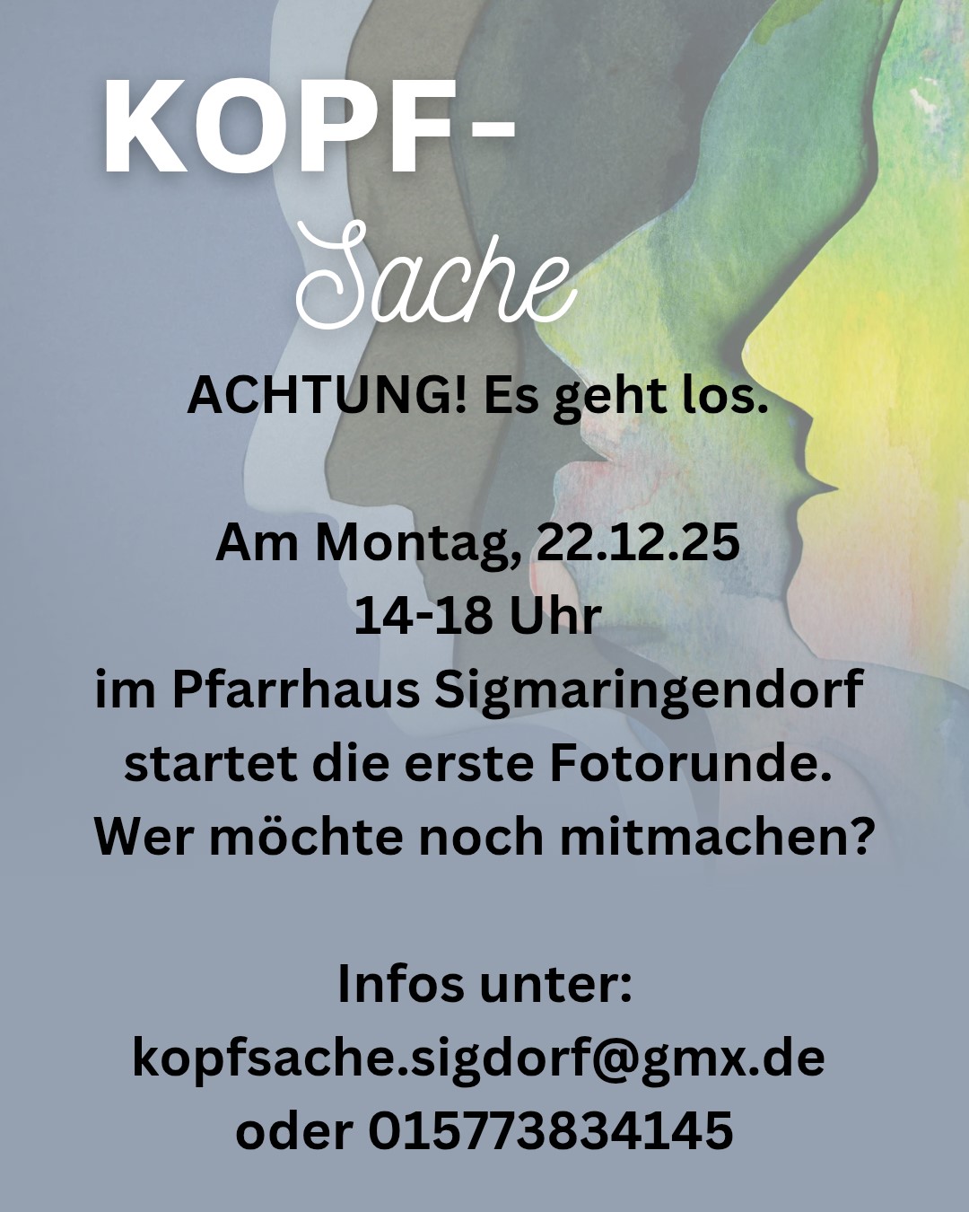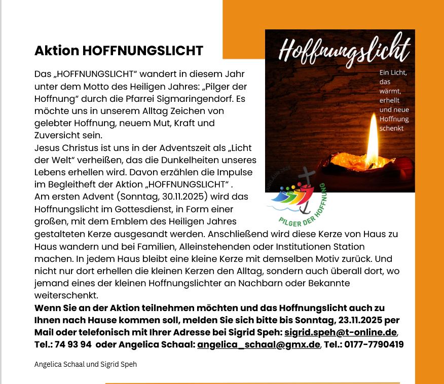 mittwochs 17.12.25Kirchenchor Sigmaringendorf ![]() Lobpreis- Entspannung - Gemeinschaft Lust mitzusingen? Kirchenchor Sigdorf Do, 19.30 Uhr im kath.Gemeindehaus Wer singt, betet doppelt. ![]() |
