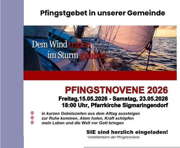ab 01.01.2026 Teil der "Pfarrei neu" ![]() > "Von Herz zu Herz" Ausgabe Fastenzeit/Oster 2026 > Infos zu Pfarrei neu > Anbetungstage 2026Termine im 1.Halbjahr 2026 immer mittwochs ab 8.30 Uhr 11.Februar / 08.April / 08.Juni |