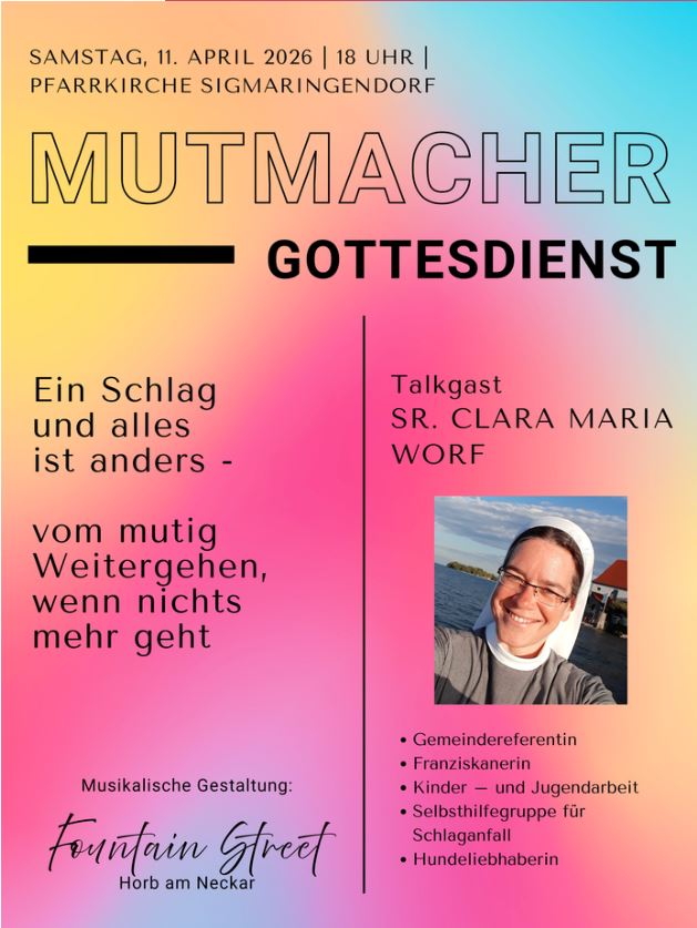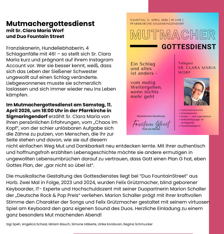 1 Jahr lang war Ida Halmer in Kambodscha > in einem Blog erzählt sie von diesem Einsatz Kirchenchor Sigmaringendorf ![]() Lobpreis- Entspannung - Gemeinschaft Lust mitzusingen? Kirchenchor Sigdorf Do, 19.30 Uhr im kath.Gemeindehaus Wer singt, betet doppelt. |