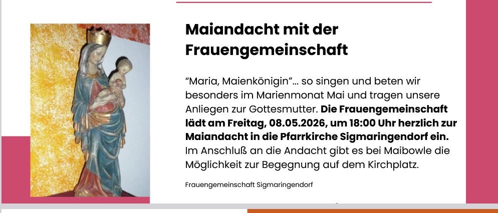 ab 01.01.2026 Teil der "Pfarrei neu" ![]() > "Von Herz zu Herz" Ausgabe Fastenzeit/Oster 2026 > Infos zu Pfarrei neu > Anbetungstage 2026Termine im 1.Halbjahr 2026 immer mittwochs ab 8.30 Uhr 11.Februar / 08.April / 08.Juni |